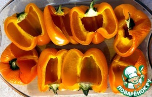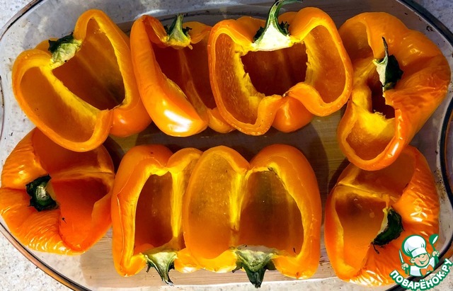 4. Моем и чистим перец от семян, разрезав его пополам, но сохранив черешок, чтобы он при запекании поддерживал форму перчиков.