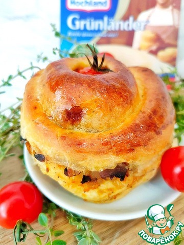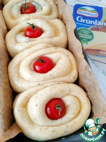 По истечении времени смажьте пирог яйцом, смешанным с молоком. В середину каждой заготовки вставьте томат черри. Отправьте в разогретую духовку (t - 180). Выпекайте 45-50 минут, до готовности.