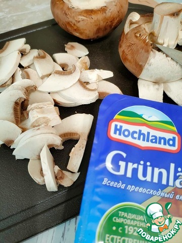 Приготовьте начинку. Грибы почистите и нарежьте пластинами.