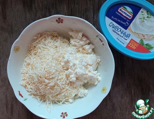 Творожный сыр смешать с адыгейским сыром (у меня копчёный), натертым на мелкой тёрке.