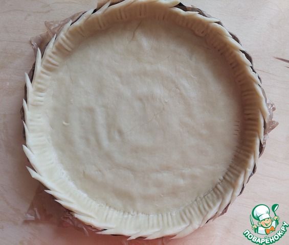 Распределить тесто в форме (диаметр 28 см.). Форму, при необходимости, застелить бумагой для выпечки и смазать растительным маслом.