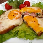 Аккуратно выкладываем сверху желтки и поджариваем под крышкой уже до готовности (чтобы расплавился сыр и желток приготовился до необходимого вам состояния).