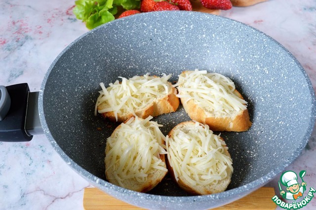 На решетке гриля или сухой сковороде поджарить ломтики багета с одной стороны. Перевернуть, посыпать поджаренную сторону тертым сыром. Еще немного подержать на огне, пока сыр не расплавится.