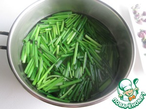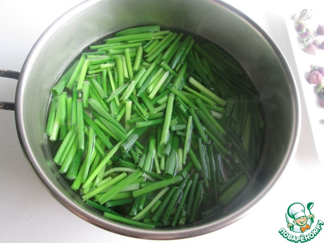 • Стрелки лука вымыть, отделить семенные коробочки и нарезать на кусочки по 2-3 см