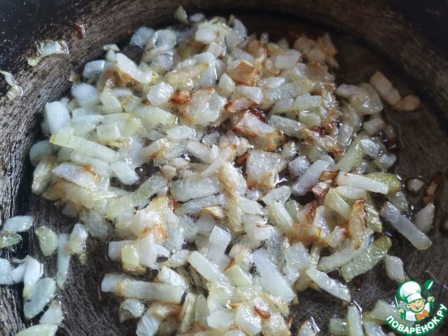 Фасоль выложить из банки и промыть. Репчатый лук измельчить и спасеровать на растительном масле до золотистости.