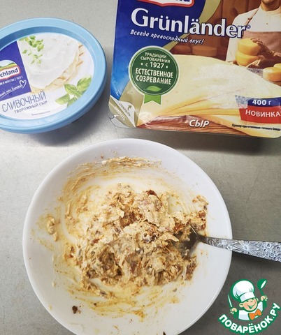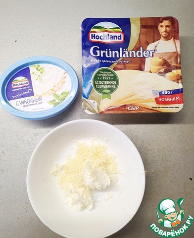 Смешать два вида сыра: творожный и мелконатертый твердый сыр.