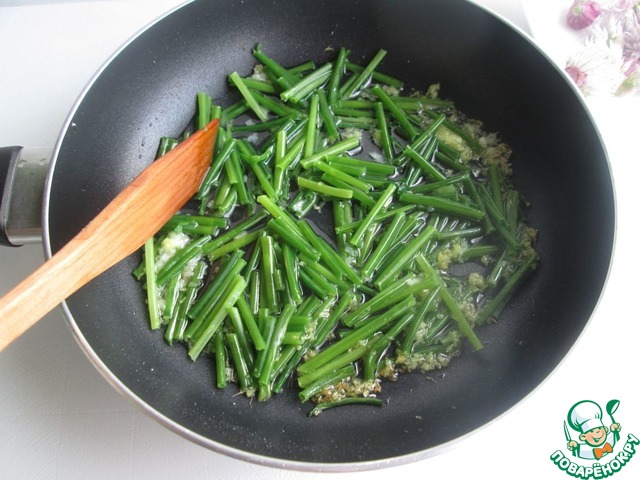 Добавить луковые стрелки, перемешать, накрыть крышкой и тушить на малом огне 5 минут.