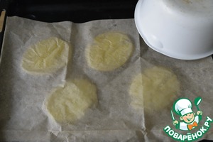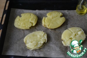 Противень застилаем пекарской бумагой, смазываем маслом, кладём картофель. -