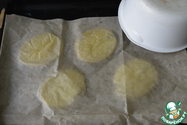 Накрываем картофель другим листом бумаги и придавливаем дном кастрюли (сотейника), чтобы слегка расплющить.