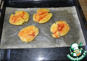 Достаём противень с картофелем и быстро, чтобы не успел остыть, смазываем кисточкой кетчупом.