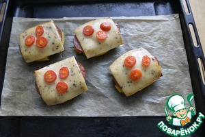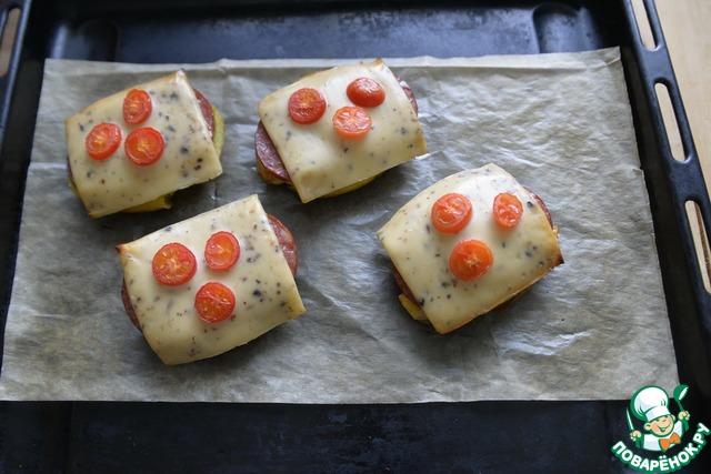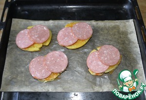 Сверху кладём по два тонких кружка колбасы, у меня варено-копчёная, можно сервелат, ветчину.