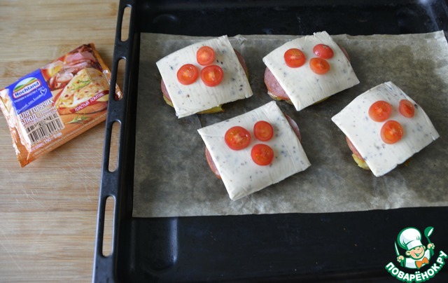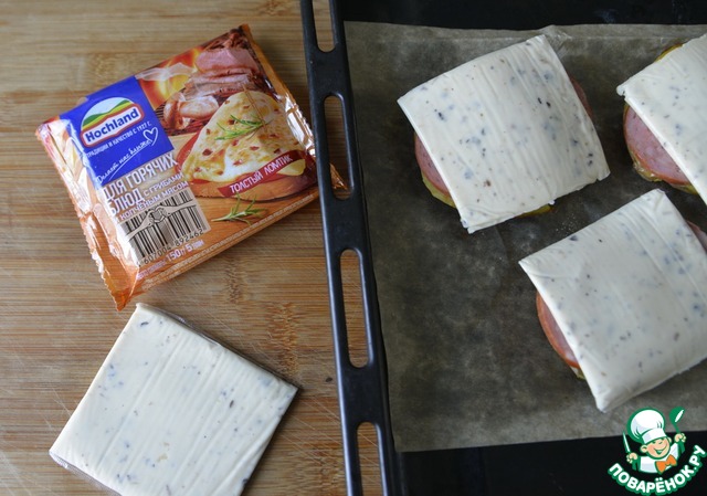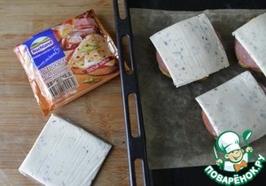 Далее кладём ломтики (пластины) плавленого сыра, у меня ТМ Hochland для горячих блюд.