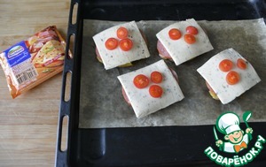 Помидоры черри режем тонкими кружками, кладём на сыр. Ставим всё в духовку в верхнее положение, готовим ещё 10 минут при 220 градусах.