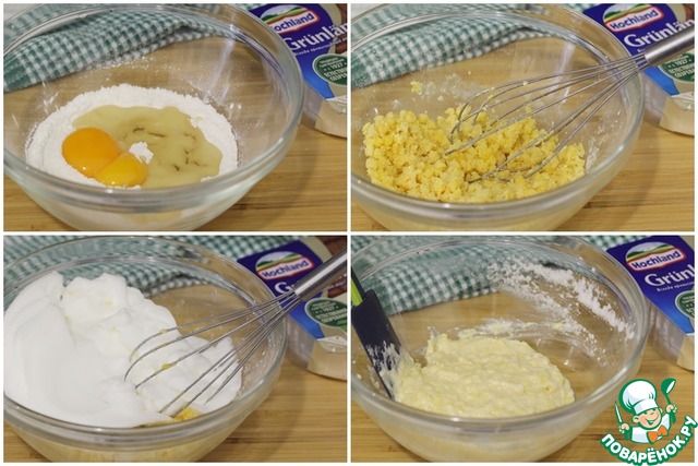 Ввести взбитые белки и лопаткой аккуратно вмешать их в тесто. -