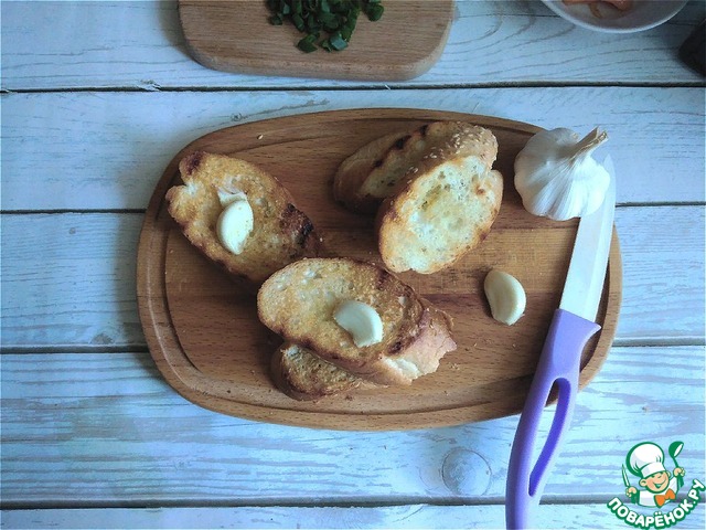 Снимаем хлеб со сковороды и сразу же горячий натираем чесноком.