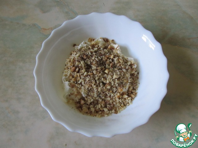 Грецкие орехи обжарить на сухой сковороде и мелко порубить. Немного орехов отложить для посыпки, остальные всыпать в сырную массу.