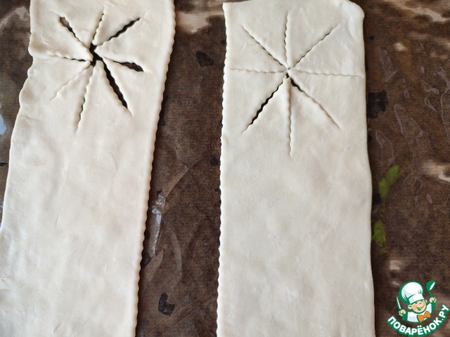 Тесто раскатываем в одну сторону, получившийся прямоугольник делим вдоль на две полоски. Визуально делим пополам и на верхней половине делаем надрезы.