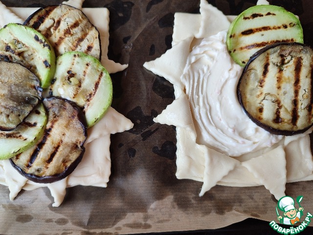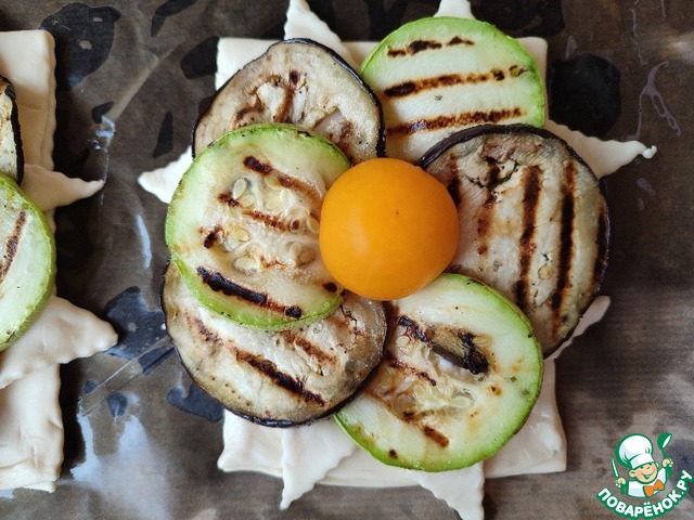 Кабачок и баклажан я предварительно обжарила без масла на сковороде-гриль. Можно обжарить на обычной или запечь до полуготовности. -