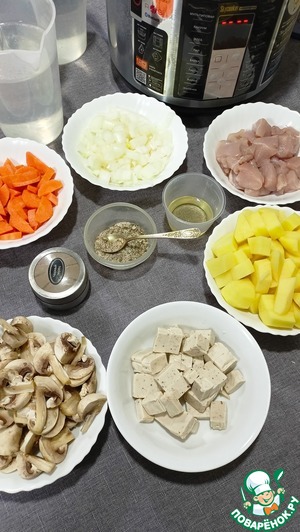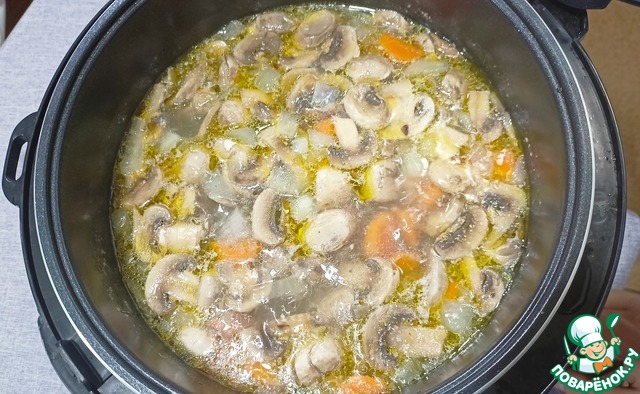 Добавляем в чашу филе, грибы, картофель, воду и специи — Режим «Суп» 40 минут.
