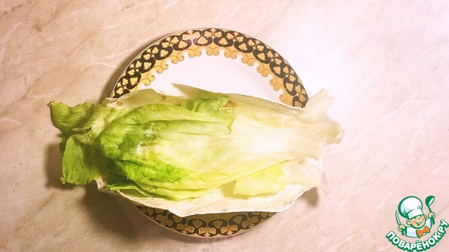 Затем на лепешку кладем листья салата.