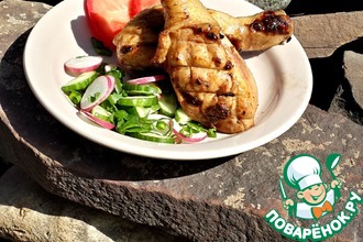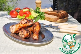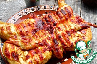 Вариация на тему шашлыка - рулетики из куриной грудки с беконом и сыром в острой обмазке из грузинской аджики! Очень просто, очень вкусно! У меня в мангале был совсем не сильный жар, скорее дым, уж очень сырые дрова деревенские, поэтому рулетики получились больше копченые, нежели жареные. Но вкусно!))