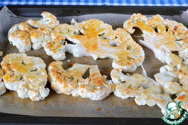 Цветную капусту нарезать ломтиками толщиной 1,5 см.