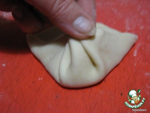 Делим тесто на небольшие лепешки и раскатываем не очень тонко, размер - где-то с блюдце. На центр 1-1,5 чайной ложки фарша. -