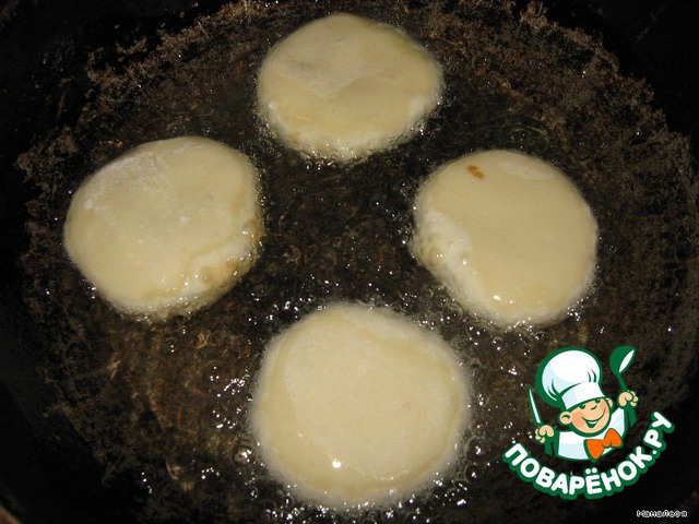 Дальше жарим в большом количестве растительного масла. Сначала кладем "юбочки" дырочкой вниз, поджариваем, аккуратно переворачивам, чайной ложкой наливаем жир со сковороды в дырочку (ну пошипит немного) и поджариваем донышко.