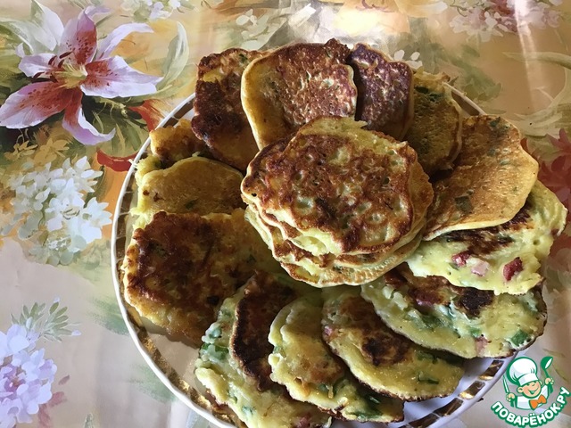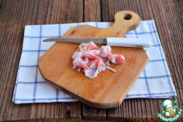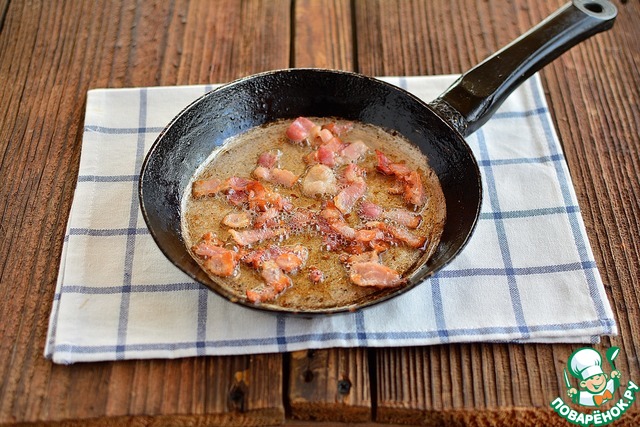 Пожарить бекон до хруста. Подмешать бекон к тесту.
