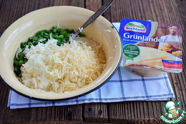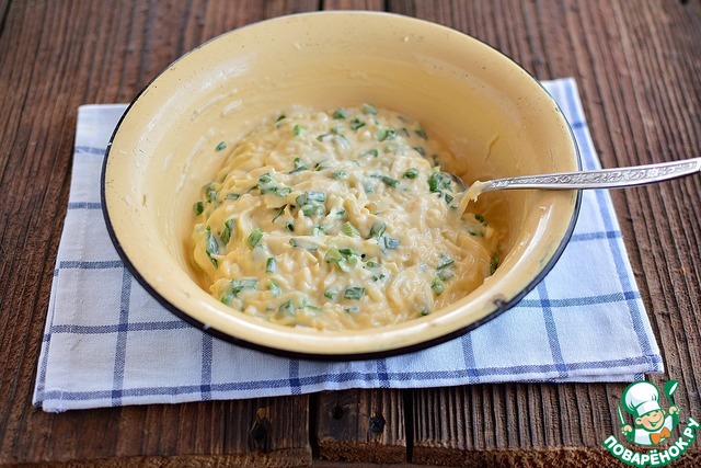 К тесту добавить тертый картофель и сыр, мелко резанный лук.