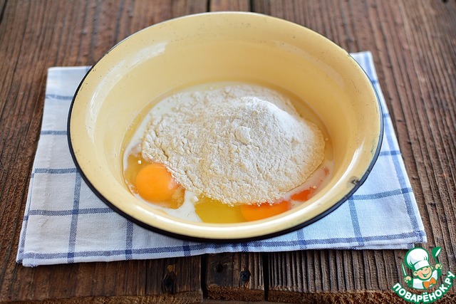 Яйца взбить с молоком и маслом. Добавить муку, соль и перец по вкусу.