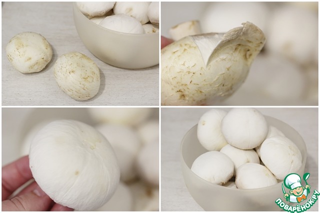 Если вам достались не самые свежие и красивые шампиньоны, есть простой способ сделать их беленькими и симпатичными. Для этого нужно лишь слегка поддеть ножом кожицу внизу шляпки и снять ее. Несколько быстрых движений и вот уже у вас хорошенький чистенький гриб.