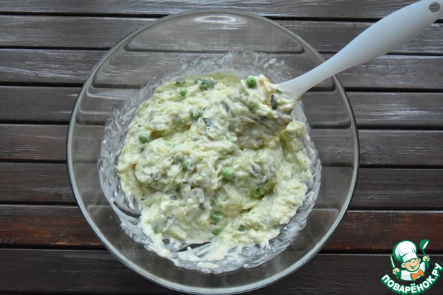 Добавляю к кабачкам измельченную зелень петрушки, яйца, сметану, зеленый горошек, и натертый на терке сыр.