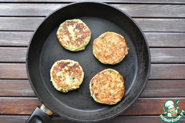 В сковороду вливаю растительное масло, разогреваю на среднем огне. Выкладываю столовой ложкой кабачковое тесто в форме оладий и обжариваю их с двух сторон до подрумянивания.