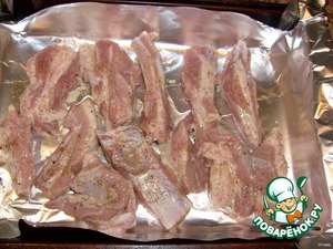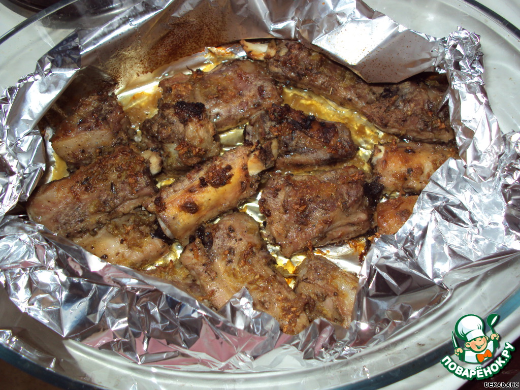• Ребра кладём в мисочку, туда выливаем нашу пряную смесь и все хорошенько перемешиваем. Потом выкладываем на протвень, накрваем сверху фольгой и в духовочку на 1 час. У меня духовка электрическая, я ставила на 350 градусов. Потом снимаем фольгу, уменьшаем немножко температуру и даем зарумяниться нашим ребрышкам. Смачного!