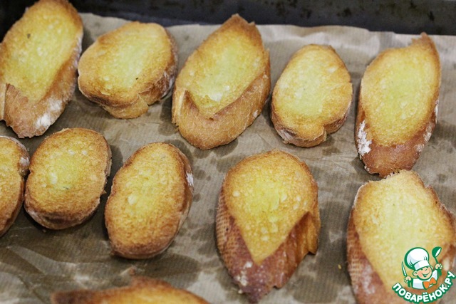 Для этого нужно нарезать багет на кусочки, смазать с обеих сторон оливковым маслом и запечь до золотистой корочки (~5 минут с одной стороны, 5 с другой).