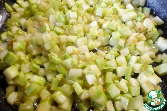 Кабачок нарезать небольшими кубиками и обжарить на хорошо разогретой сковороде с маслом до мягкости.