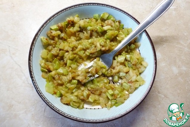 Остывшие кабачки слегка помять вилкой. Если хотите более гомогенную массу, то измельчите блендером. Мне нравится, когда в паштете есть кусочки.