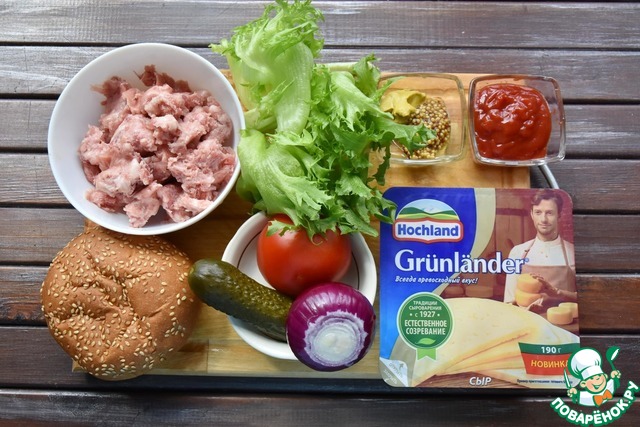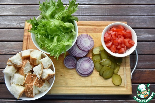 В первую очередь готовлю овощи. Томат нарезаю кубиком, предварительно освободив его от жидкой серединки с семенами. Красный лук нарезаю тонкими кольцами. Сыр натираю на крупной терке. Соленый огурец режу ломтиками. Булочку для гамбургера нарезаю небольшим кубиком.