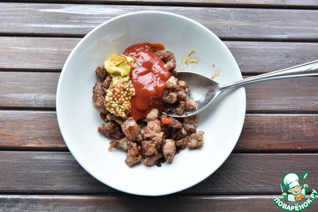 В обжаренные колбаски добавляю кетчуп и два вида горчицы: столовую и зерновую. Перемешиваю. Можно дополнить мясо соусом барбекю.