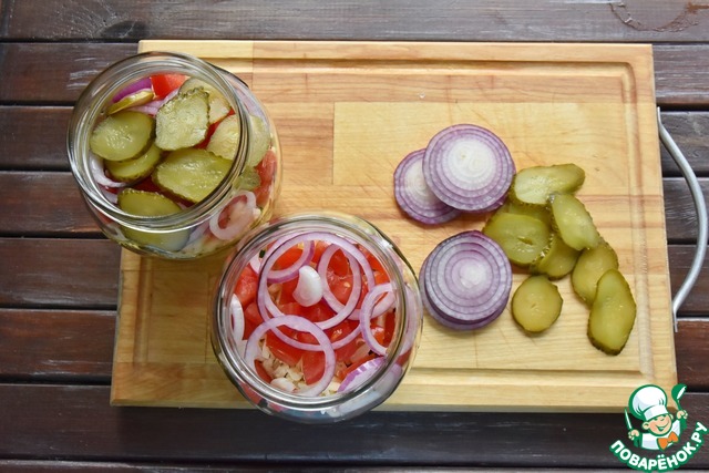 Сверху, на помидоры кладу колечки красного лука и ломтики соленого огурчика.