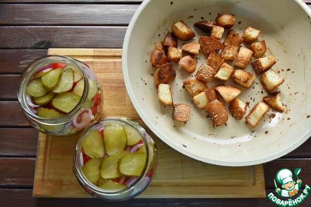 Кусочки булки для гамбургера обжариваю в жире, оставшемся от колбасок. Вы можете запечь сухарики в духовке или обжарить на масле.