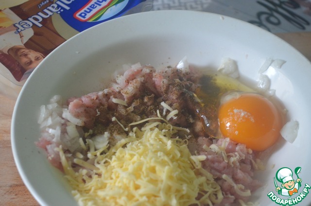 • В мясной фарш добавьте мелко нарезанный лук, тертый сыр, куриное яйцо, посолите по вкусу