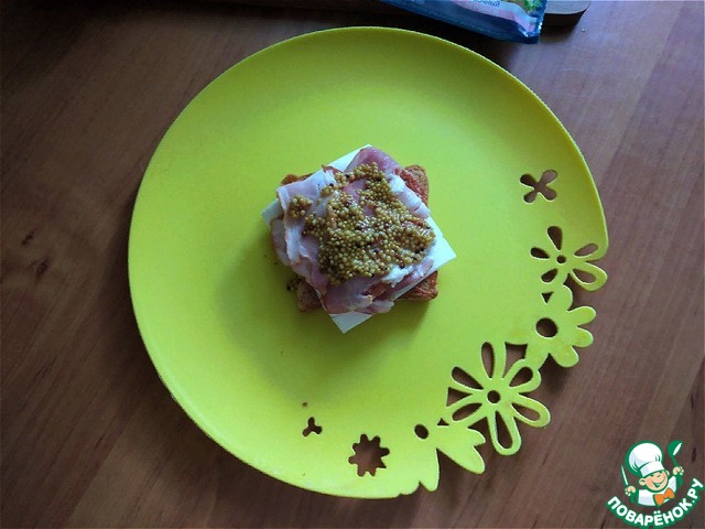 Нижний ломтик хлеба промазываем соусом. Выкладываем на него пластину сыра. На сыр - бекон свёрнутый в рулетики (3 длинных ломтика). Бекон промазываем горчицей зернистой.