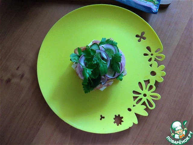 Далее накрываем вторым ломтиком хлеба, который опять промазываем томатным соусом. На соус выложила веточки сельдерея (любая зелень) и 2 ломтика ветчины из индейки. На ветчину положила порезанный на "пятачки" малосольный огурец. На огурцы -лук красный тонкими кольцами.