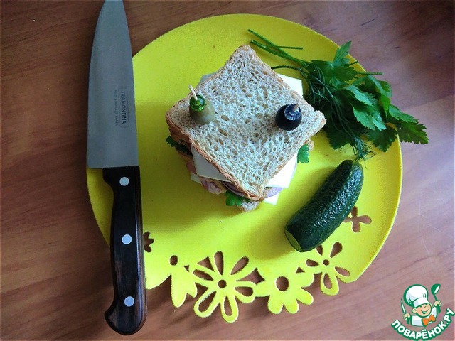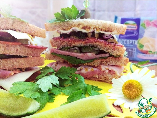 Накрываем третьим куском. Его тоже промазываем соусом и выкладываем ломтики сырокопчёной колбасы. У меня острая колбаса. На острую колбасу положила маслины и оливки по 2 шт, порезанные на кольца. Сверху веточки сельдерея и укропа. Далее - вторую пластину сыра. Четвёртый ломтик хлеба промазала горчицей и накрыла ломтиком, горчицей вниз. Сэндвич нужно в двух местах закрепить длинными шпажками. Я проколола их с маслиной и оливкой.