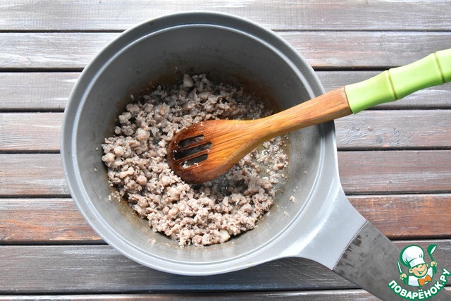 В сотейнике с толстым дном обжариваю измельченные вместе с оболочкой свиные острые колбаски. Излишки вытопившегося жира сливаю.