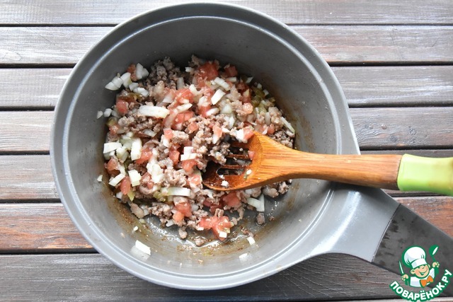 Мелким кубиком нарезаю репчатый лук, помидор, предварительно очищенный от кожицы и жидкой сердцевины с семенами. Измельчаю несколько колечек маринованного халапеньо и острый перец чили.