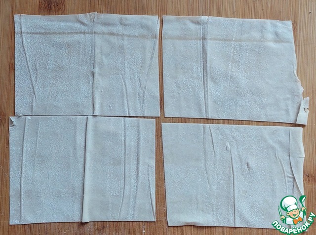 Тесто фило нужно разморозить, не открывая упаковку. Нарезать листы фило квадратами со стороной 10-12 см в зависимости от размера ваших формочек для запекания.