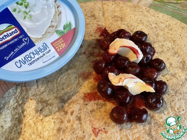 Лаваш разрежьте пополам (получится 6 листов). На один край выложите вишнёвую начинку и 2-3 ч. л. творожного сыра.
